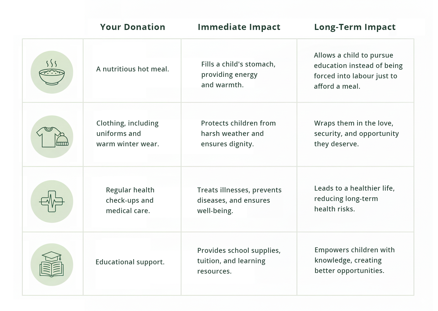 Every donation—whether it provides food, clothing, or education—offers stability and opens the door to a brighter tomorrow for an orphan in need.